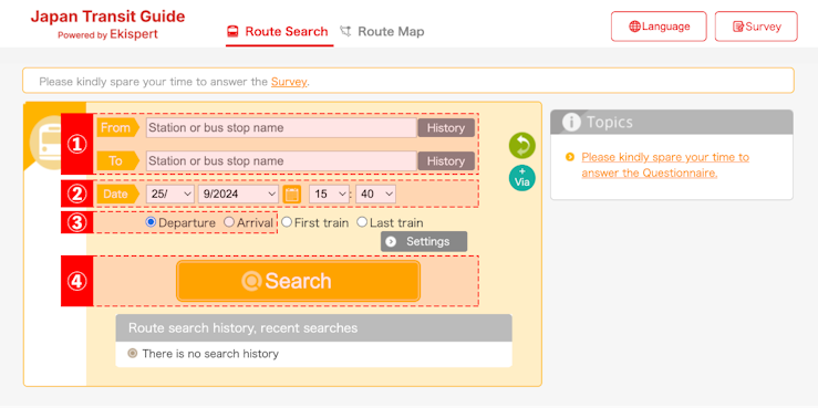 Searching for a route using "Japan Transit Guide Powered by Ekispert" is very straightforward. Just follow these simple steps: