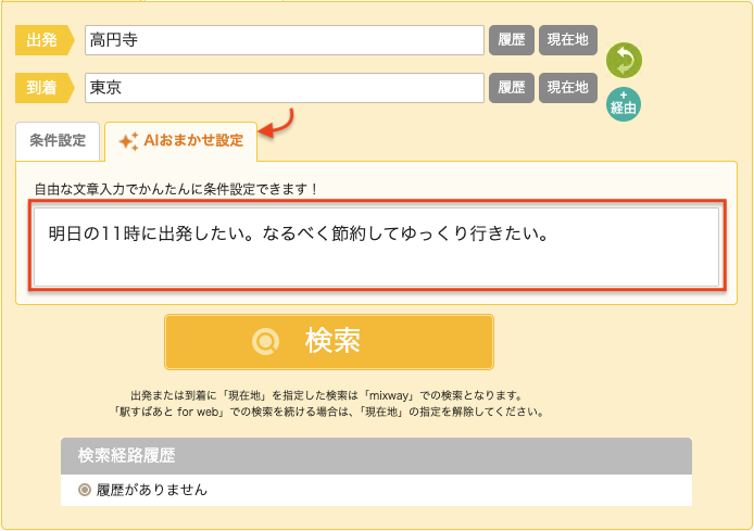 これまでのようにチェックボックスを一つずつ選ぶ代わりに、「いまのあなたの状況や希望」を文章で入力するだけで、AIが最適な検索条件(使いたい交通手段、乗り換え時間など)を代わりにセットして検索する機能です。