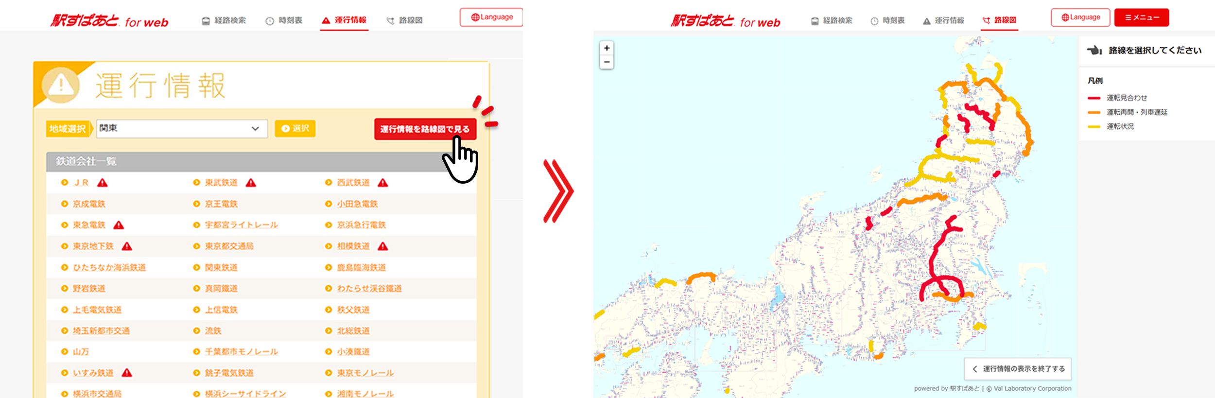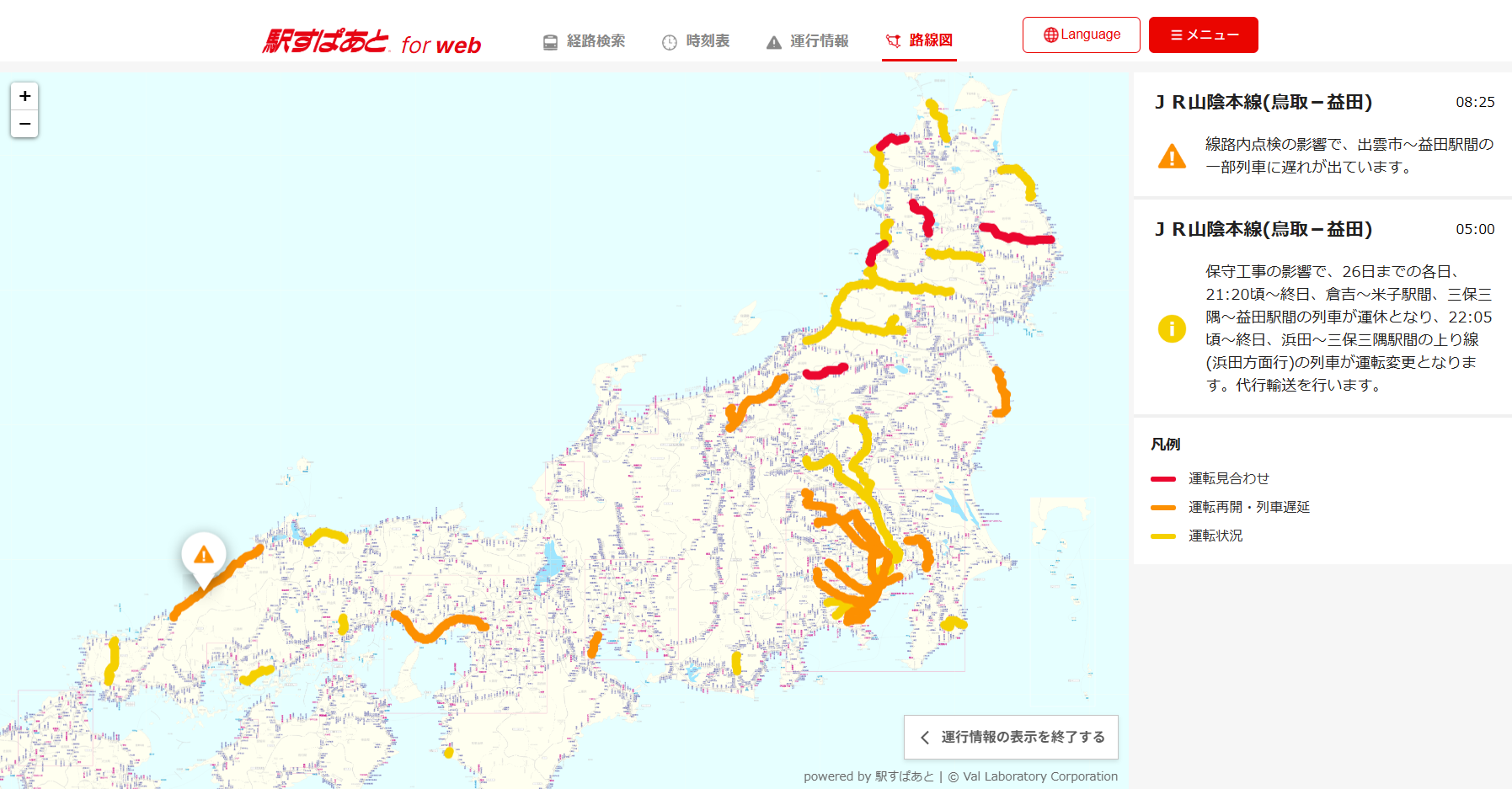 全国の鉄道が見れる「駅すぱあと」の路線図で、運行情報が確認できる機能です。