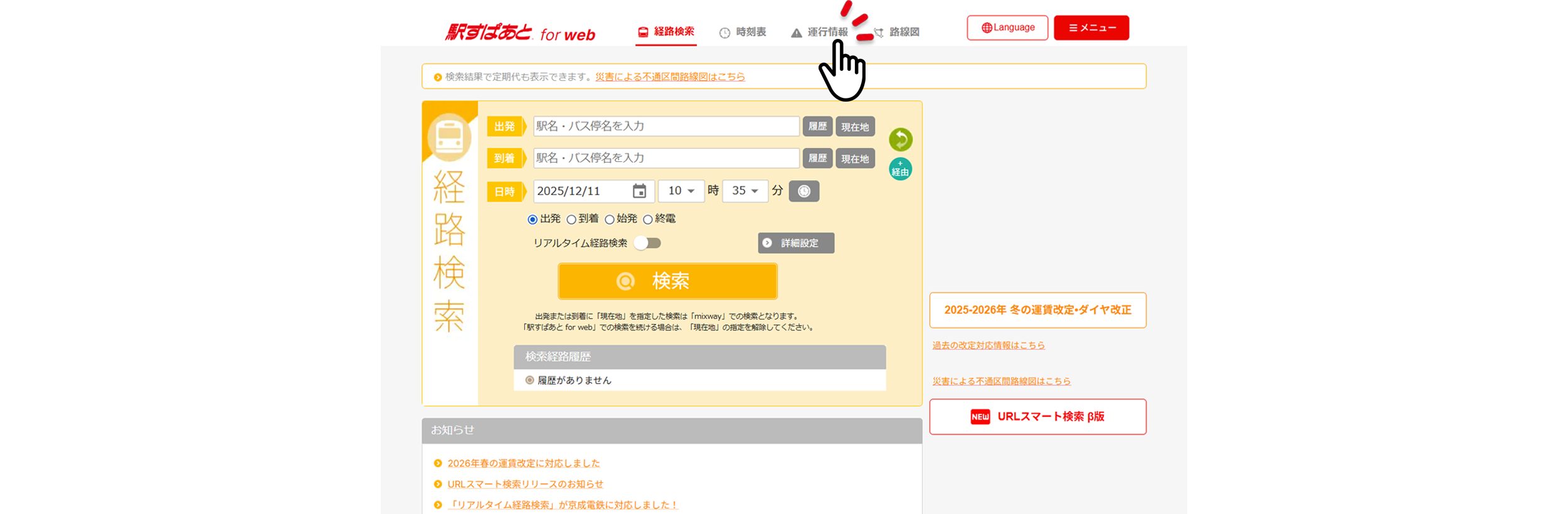 TOP画面から[運行情報]をクリックし、運行情報画面を表示します。