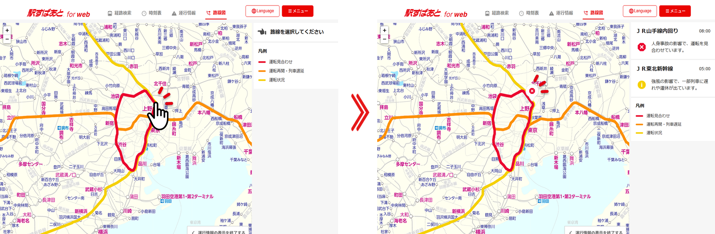 もしもの時でも「どの区間が影響を受けているのか」「通常通り運行している路線はどれか」などをひと目で把握することができます。