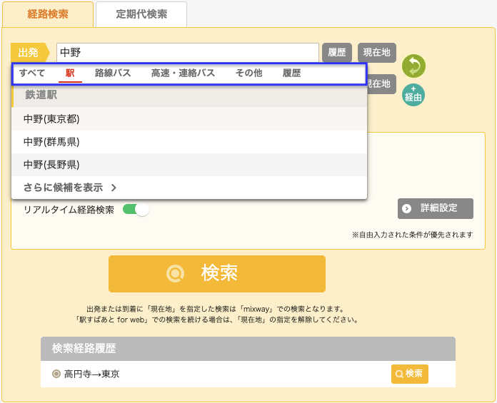 駅、路線バス、高速・連絡バス、履歴などのカテゴリごとに候補を分けて表示するようにしました。